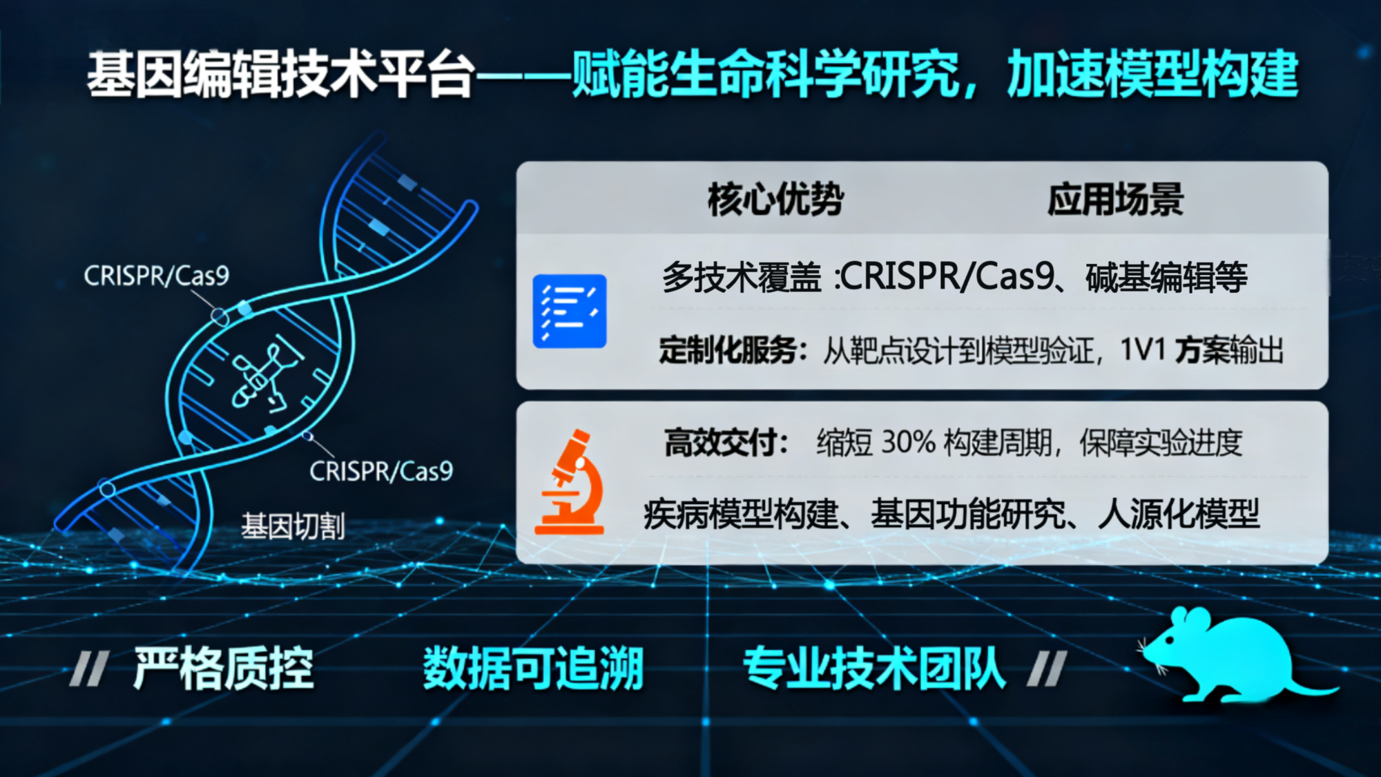基因編輯模型:提供CRISPR/Cas9等先進基因編輯技術定制的小鼠基因敲除、敲入、點突變模型,精準模擬人類遺傳性疾病。